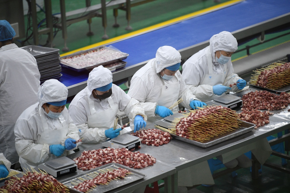 鹽池灘羊產(chǎn)業(yè)發(fā)展集團工人在流水線上分揀羊肉(5月2日攝)。