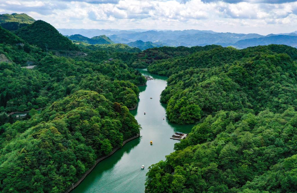 5月2日,游客在貴州省正安縣九道水景區(qū)乘船觀光(無人機照片)。新華社記者楊文斌攝
