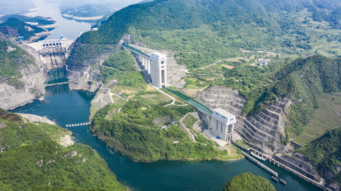 500噸級標船從遵義市構皮灘水電站通航工程下游引航道駛入第三級承船廂(2021年6月22日攝,無人機照片)。新華社記者 陶亮 攝