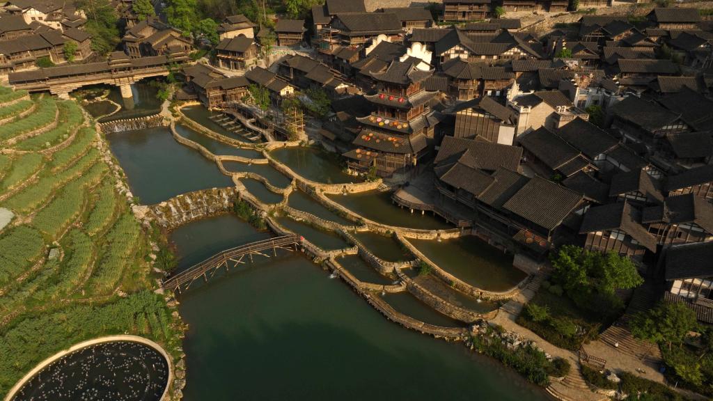 4月11日拍攝的貴州省遵義市播州區(qū)烏江寨景區(qū)一角(無人機照片)。新華社記者楊楹攝
