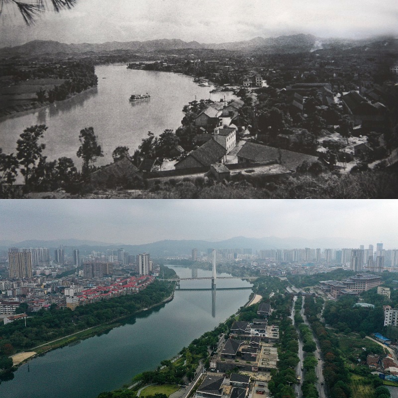 拼版照片:上圖為1917年的百色縣城(資料圖片,百色市檔案館提供);下圖為2022年5月8日拍攝的百色市(新華社記者張愛林?jǐn)z,無人機(jī)照片)。新華社發(fā)