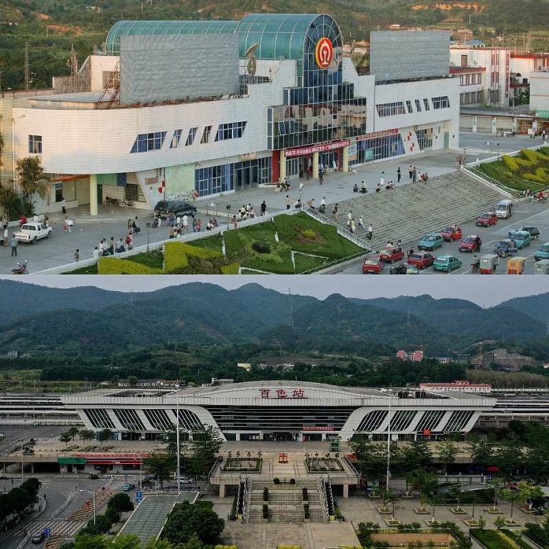 拼版照片:上圖為1995年的百色市火車站(資料圖片,中國鐵路南寧局集團(tuán)有限公司提供);下圖為2022年5月7日拍攝的百色市火車站(新華社記者張愛林?jǐn)z,無人機(jī)照片)。