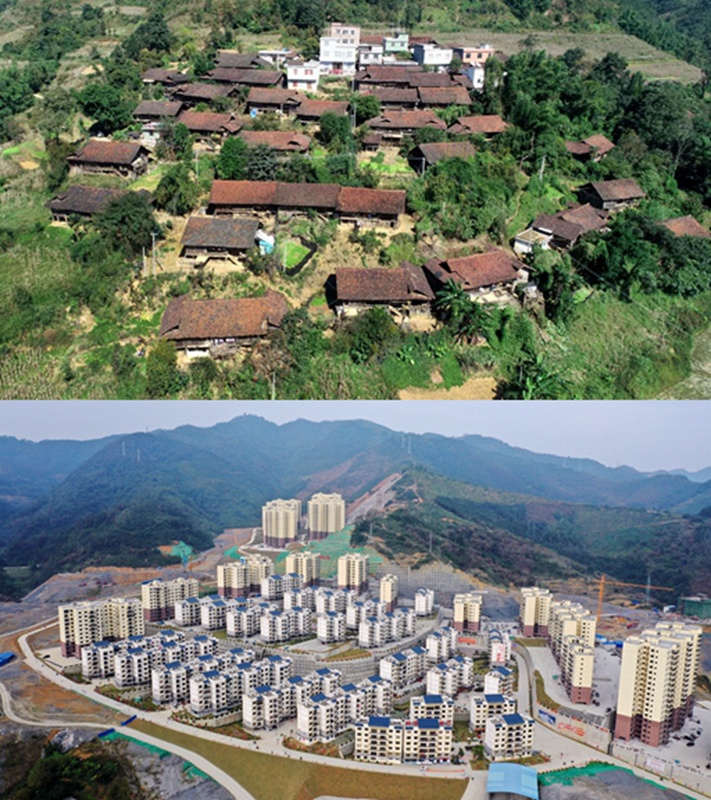 拼版照片:上圖為百色市隆林各族自治縣金鐘山鄉(xiāng)平流村坡安屯群眾搬遷前的住房(2016年5月24日攝);下圖為坡安屯群眾易地搬遷到新的安置點(diǎn)后居住的樓房(2019年12月3日攝)。新華社記者 張愛林 攝
