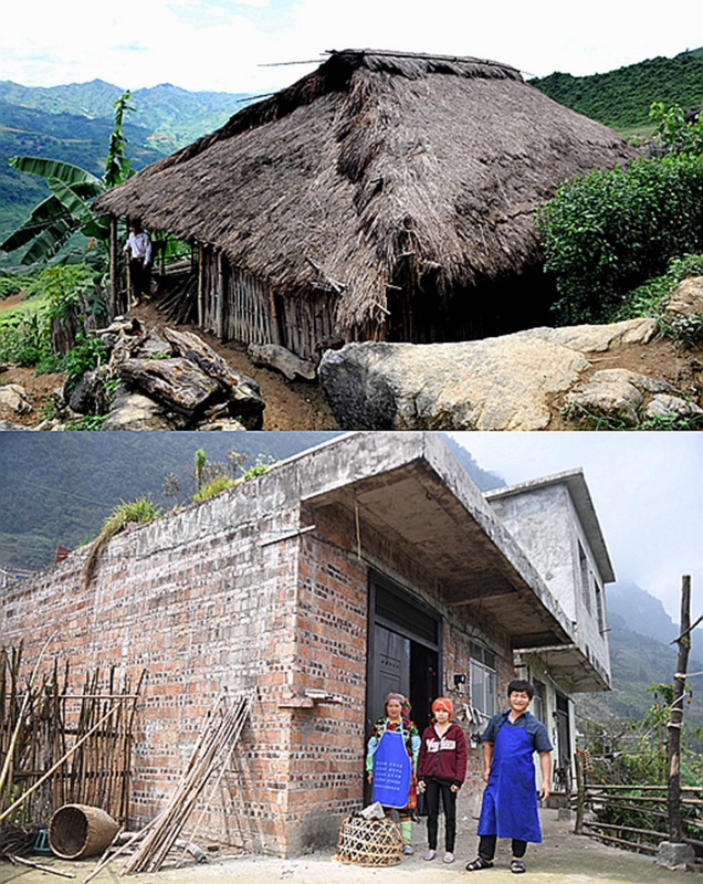 拼版照片:上圖為百色市那坡縣上保屯群眾曾經(jīng)居住的茅草房(2008年5月26日攝);下圖為上保屯群眾搬遷后居住的樓房(2018年4月24日攝)。新華社記者 張愛林 攝