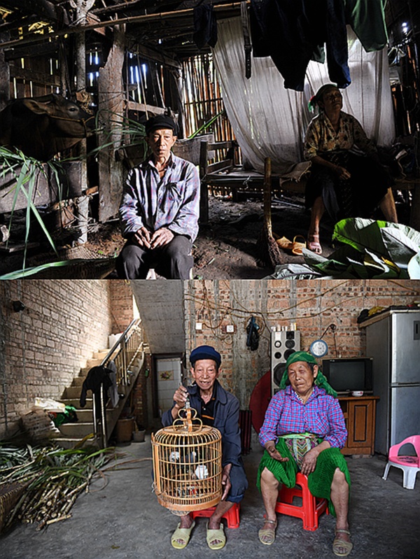 拼版照片:上圖為百色市那坡縣上保屯群眾陶文勝搬遷前的生活照(2008年5月26日攝);下圖為陶文勝搬遷后的生活照(2018年4月24日攝)。新華社記者 張愛林 攝