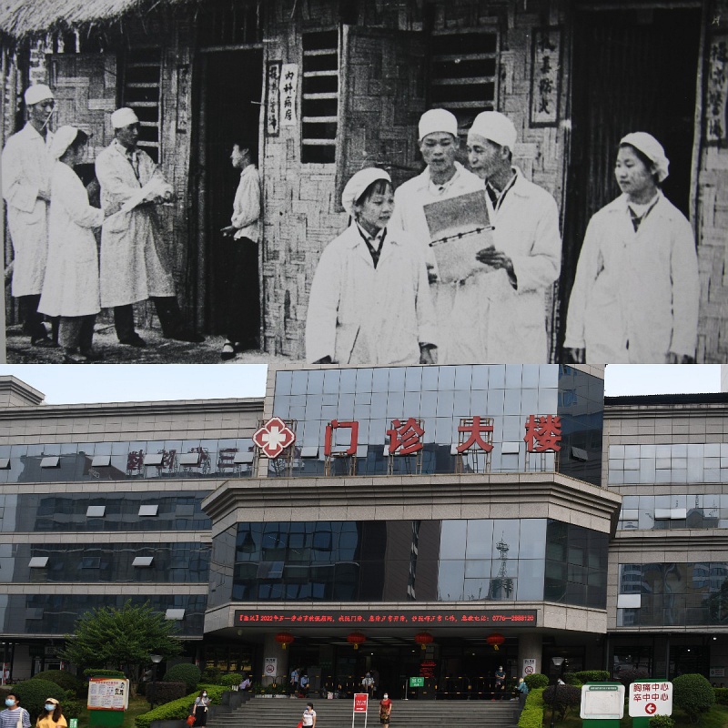 拼版照片:上圖為1951年百色市右江民族醫(yī)院建設(shè)初期場(chǎng)景(資料圖片,百色市檔案館提供);下圖為2022年5月7日拍攝的百色市右江民族醫(yī)院門診樓(新華社記者張愛林?jǐn)z)。新華社發(fā)