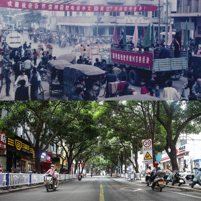 拼版照片:上圖為1990年的百色市中山路(資料圖片,百色市檔案館提供);下圖為2022年5月8日拍攝的百色市中山路(新華社記者張愛林?jǐn)z)。新華社發(fā)