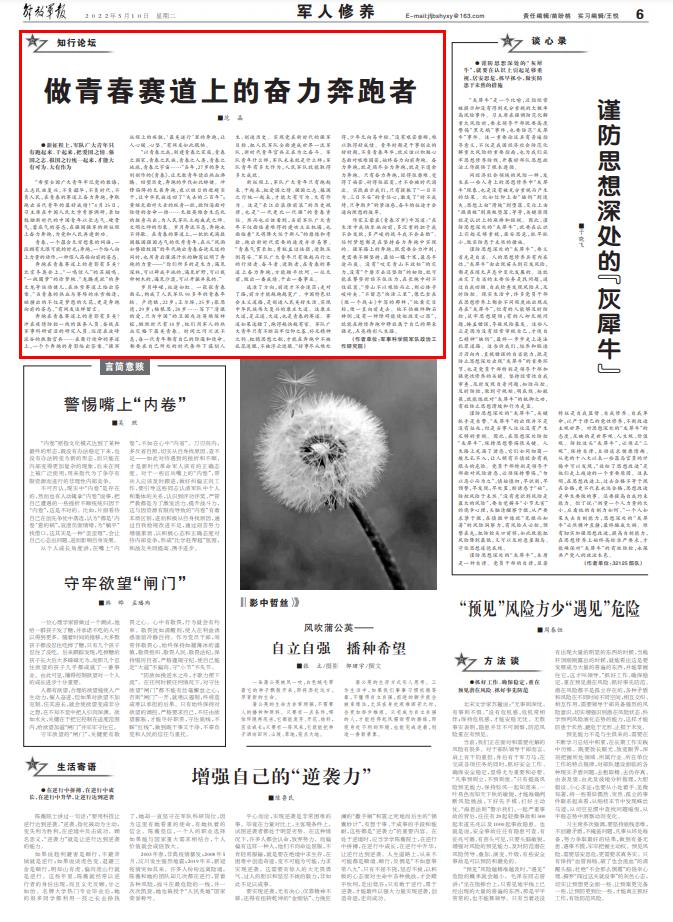 作家王蒙在《青春萬歲》中寫道:“在生活中我快樂地向前,多沉重的擔(dān)子我不會發(fā)軟,多嚴(yán)峻的戰(zhàn)斗我不會丟臉”。任何夢想都是在堅(jiān)持奮力奔跑中實(shí)現(xiàn)的。強(qiáng)軍路上的奔跑,既需要全力沖刺,更需要不懈堅(jiān)持,最怕一曝十寒,最忌半途而廢。沒有“咬定青山不放松”的定力,沒有“千磨萬擊還堅(jiān)勁”的韌勁,就可能在攀登時(shí)頂不住壓力,在長跑中耐不住寂寞?!暗巧讲灰云D險(xiǎn)而止,則必臻乎峻嶺矣?!辈涣魬佟翱旎钊铩?,像巴金在《做一個(gè)戰(zhàn)士》中寫的那樣,“他看定目標(biāo),便一直向前走去。他不怕被絆腳石摔倒,沒有一種障礙能使他改變心思”,就能在持續(xù)奔跑中釋放屬于自己的那束強(qiáng)光,點(diǎn)亮精彩人生路。