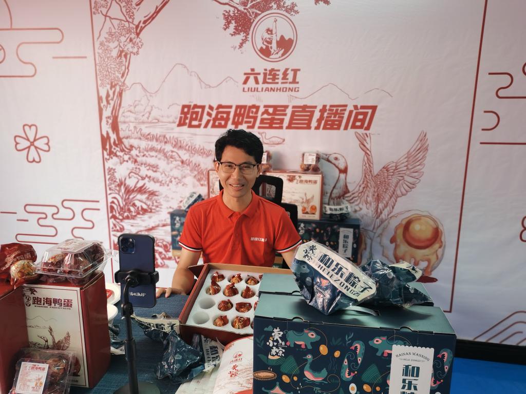 六連村食品廠負責人莫澤錦通過網(wǎng)絡直播銷售咸鴨蛋。 新華社記者趙葉蘋攝