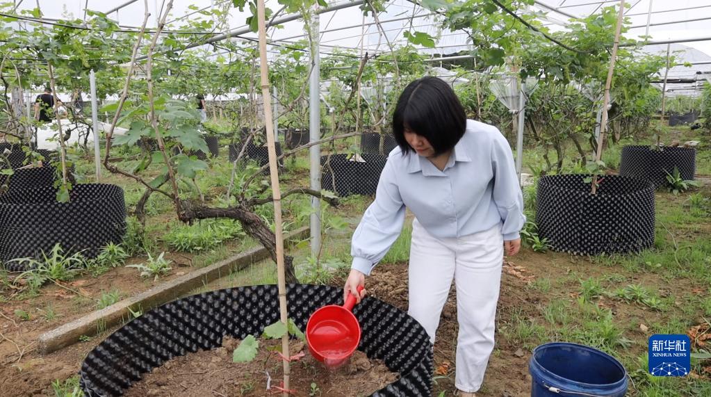 廣西全州縣才灣鎮(zhèn)毛竹山村村民王佳在大棚內(nèi)給葡萄澆水(視頻截圖,5月11日攝)。新華社記者 梁舜 攝