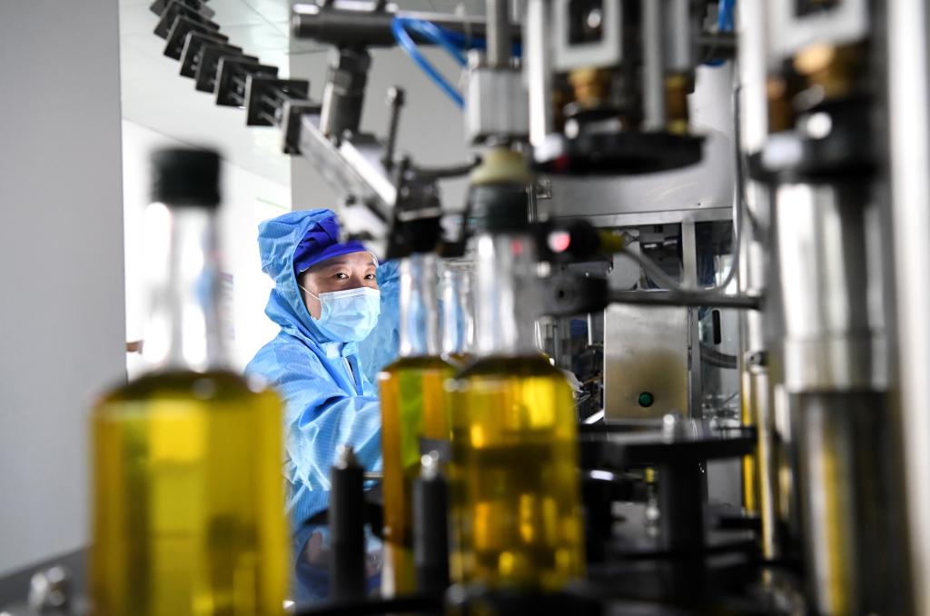 工作人員在河南省光山縣一家油茶加工企業(yè)的灌裝車間作業(yè)。新華社記者郝源攝