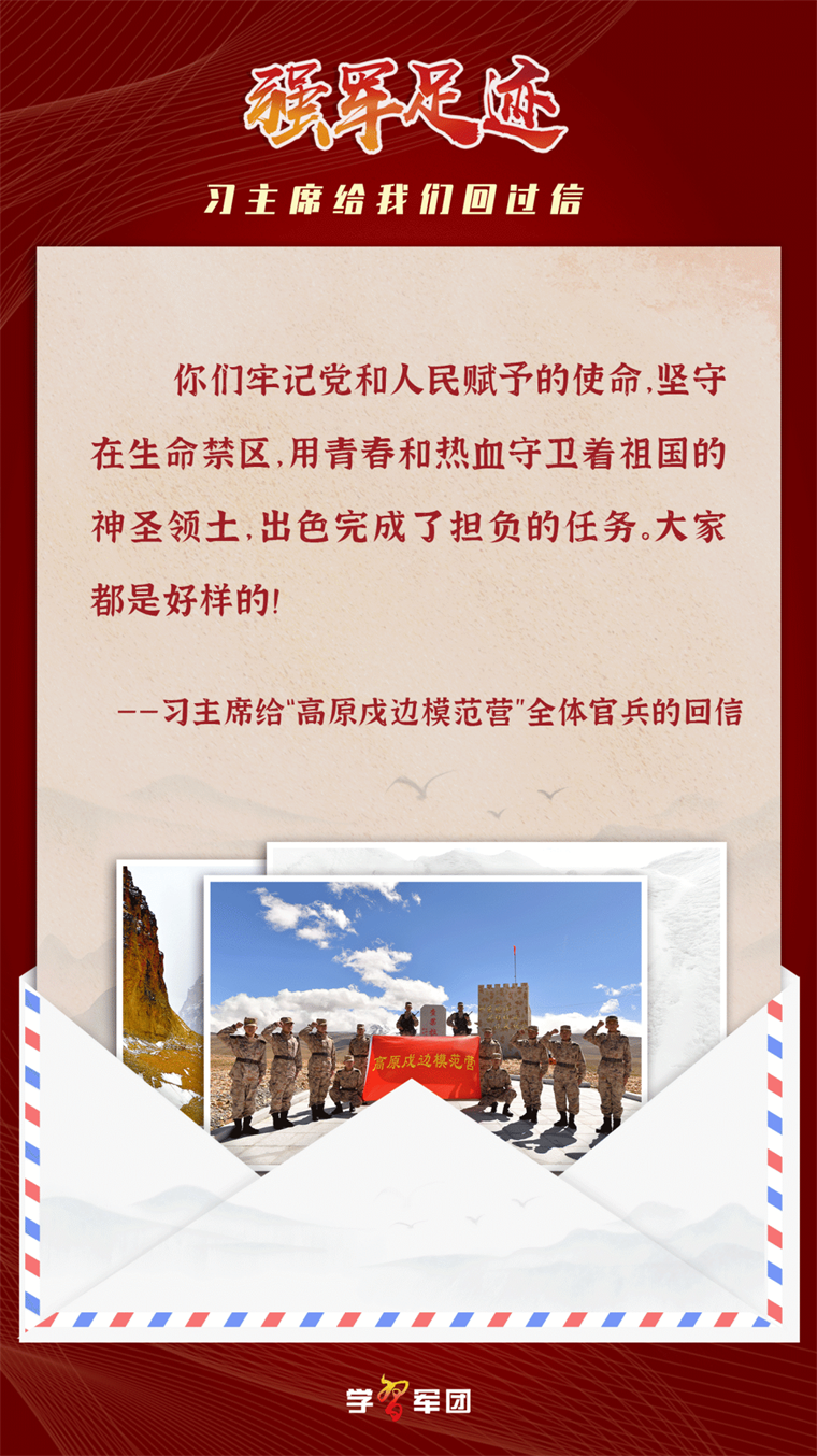習(xí)主席回信勉勵(lì):你們牢記黨和人民賦予的使命,堅(jiān)守在生命禁區(qū),用青春和熱血守衛(wèi)著祖國(guó)的神圣領(lǐng)土,出色完成了擔(dān)負(fù)的任務(wù)。大家都是好樣的!