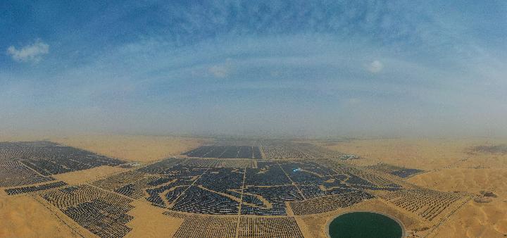 內(nèi)蒙古達(dá)拉特光伏發(fā)電應(yīng)用領(lǐng)跑基地的“駿馬電站”。新華社記者劉磊 攝