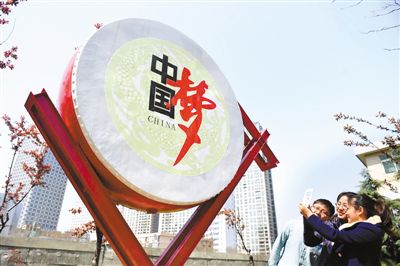 2015年3月,安徽省合肥市,市民在“中國(guó)夢(mèng)”大鼓主題雕塑旁拍照。