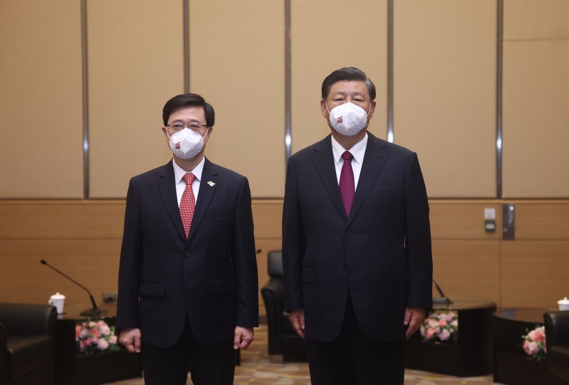 7月1日上午,國(guó)家主席習(xí)近平在香港會(huì)見(jiàn)剛剛就職的香港特別行政區(qū)行政長(zhǎng)官李家超。新華社記者 鞠鵬 攝