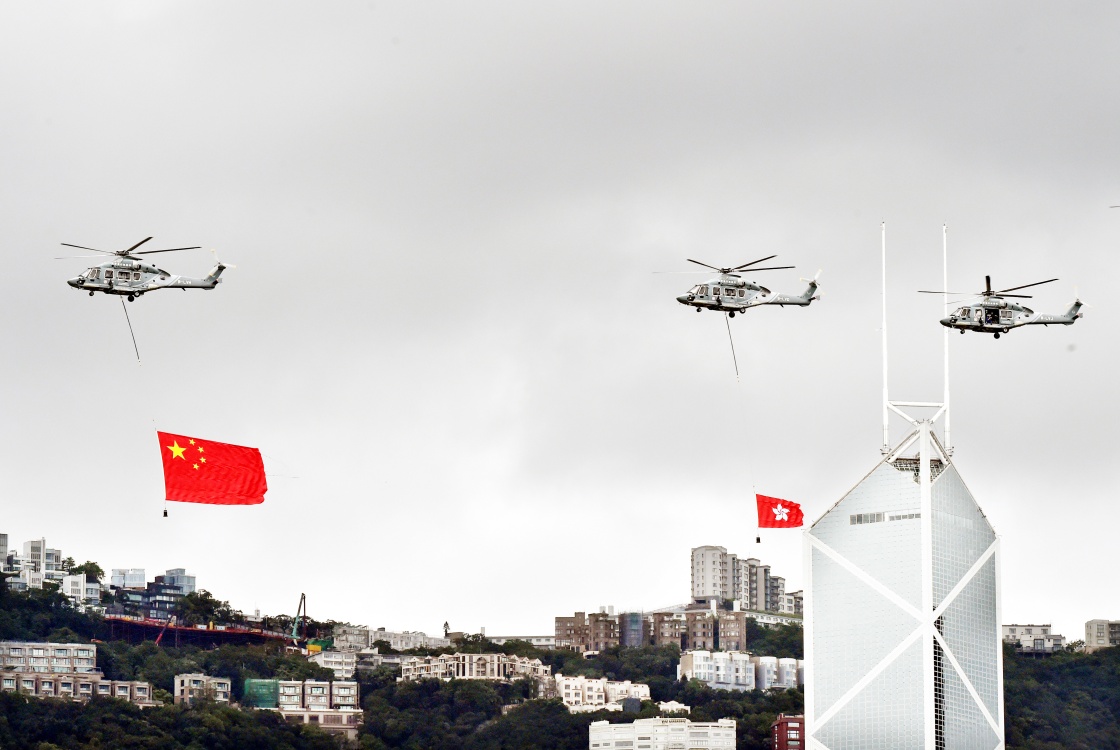 同時,香港特區(qū)政府飛行服務隊的直升機隊在維多利亞港上空飛過,領航直升機懸掛大幅國旗,區(qū)旗緊隨其后。海面上,香港紀律部隊消防輪噴灑水柱敬禮。