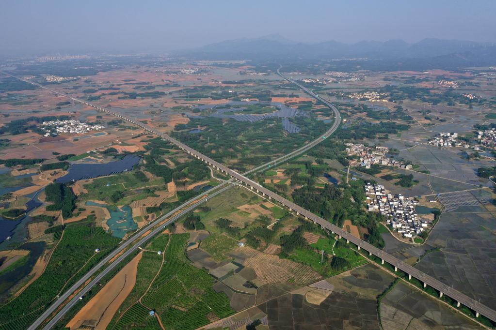 南廣高鐵和蒼碩高速在廣西賓陽縣古辣鎮(zhèn)交會(無人機照片,4月4日攝)。新華社記者黃孝邦攝
