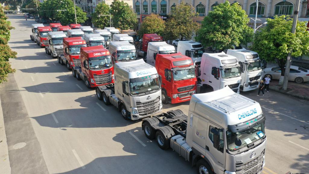重型卡車在龍州縣水口口岸等待通關出口。(龍州縣融媒體中心供圖)
