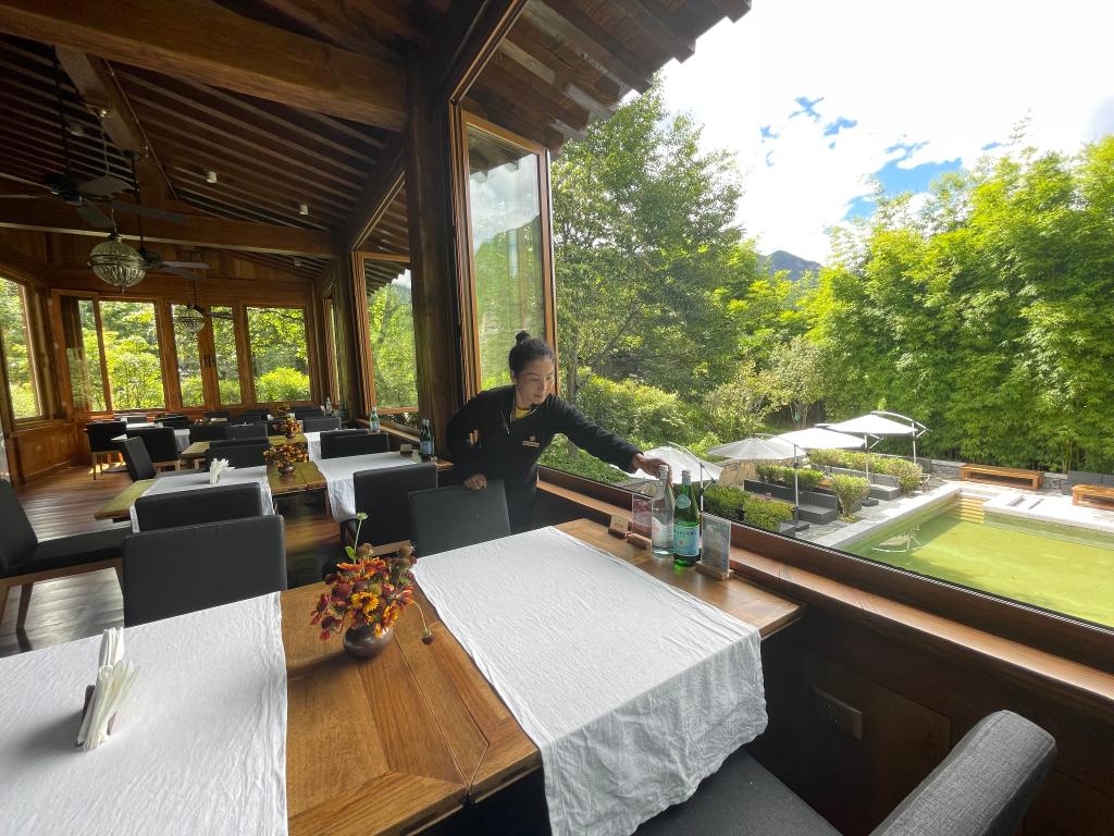 云南維西縣塔城鎮(zhèn)松贊塔城酒店負責(zé)人古麗英在整理餐桌。(新華社記者楊靜攝)
