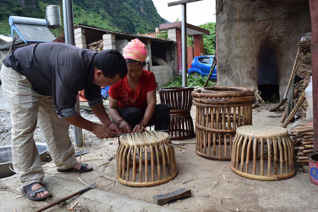 云南耿馬縣勐撒鎮(zhèn)翁達村黨總支書記俸紹春指導(dǎo)群眾編制藤蔑鼓凳。(受訪對象供圖)