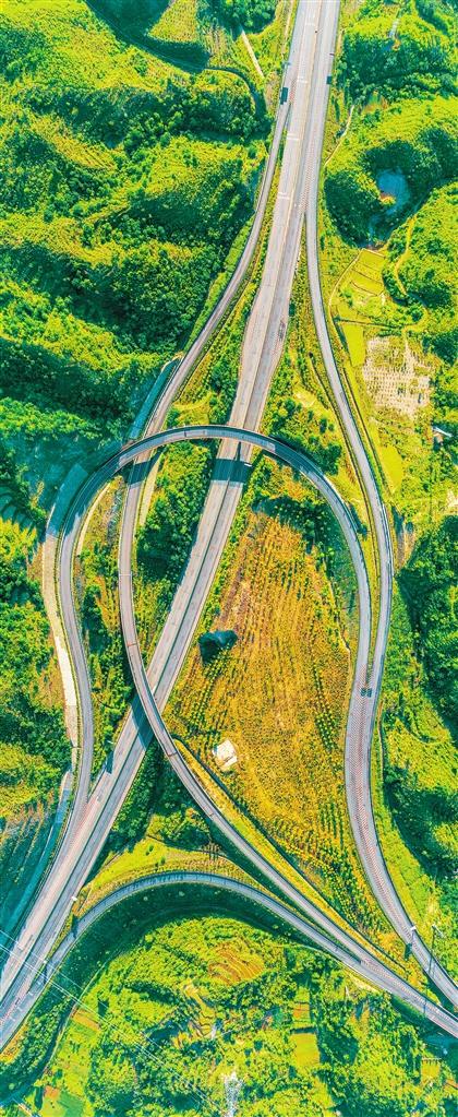 俯瞰太行山高速和滄榆高速在阜平境內(nèi)互通交匯處。便捷的交通網(wǎng)絡(luò)促進(jìn)了阜平經(jīng)濟(jì)快速發(fā)展。