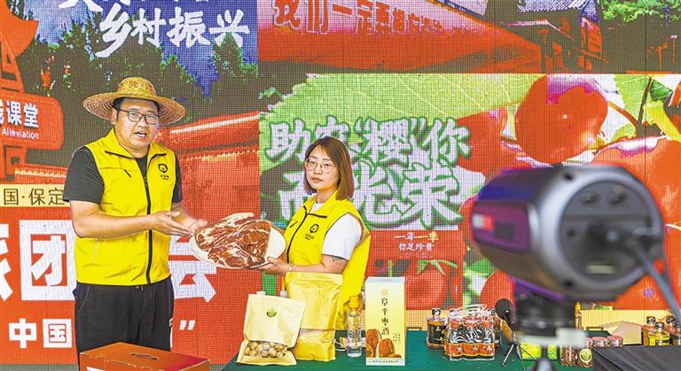 阜平縣駱駝灣村“農(nóng)旅團(tuán)購會(huì)”直播團(tuán)隊(duì),在為當(dāng)?shù)剞r(nóng)副產(chǎn)品直播帶貨。
