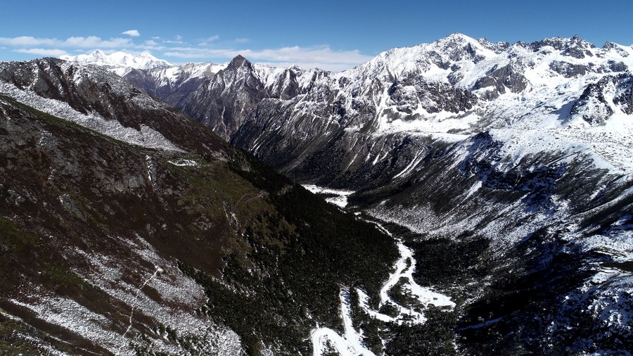 通往西藏洛扎縣拉郊鄉(xiāng)杰羅布村的道路(1月17日攝,無人機(jī)照片)。新華社記者 韓曦樂 攝