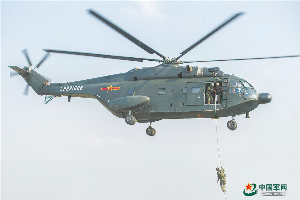 戰(zhàn)機(jī)懸停,偵察隊(duì)員滑降進(jìn)入“戰(zhàn)場(chǎng)”。