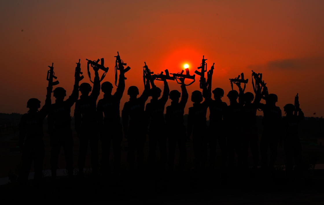 夕陽西下,武警北京總隊(duì)機(jī)動(dòng)第一支隊(duì)官兵結(jié)束了一天的訓(xùn)練(6月8日攝)。新華社發(fā)(李超 攝)