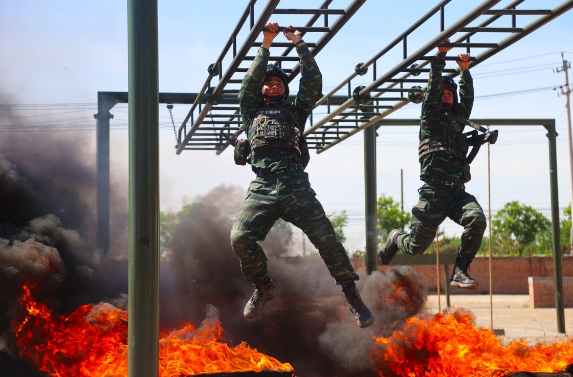 武警北京總隊(duì)機(jī)動(dòng)第一支隊(duì)特戰(zhàn)隊(duì)員進(jìn)行突破障礙訓(xùn)練(5月14日攝)。新華社發(fā)(李超 攝)