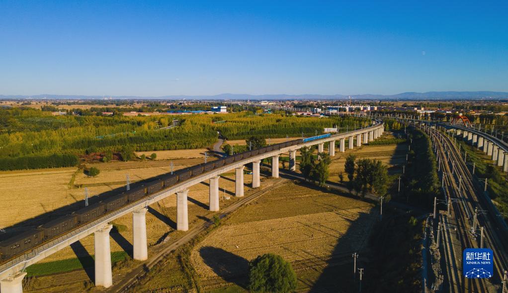 這是在內(nèi)蒙古呼和浩特拍攝的運煤專列(2021年10月15日攝,無人機照片)。新華社發(fā)(夏亮 攝)