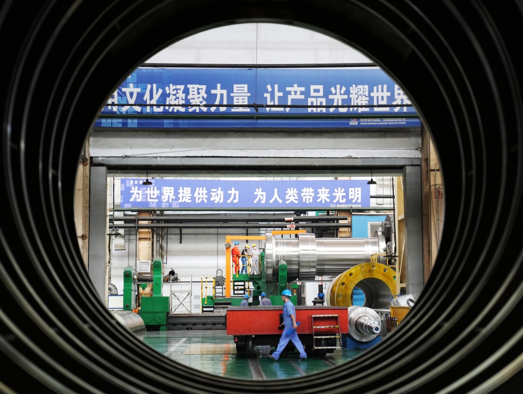 在哈電集團哈爾濱電機廠有限責任公司車間,工人進行生產(chǎn)作業(yè)(2022年6月27日攝)。新華社記者 王建威 攝