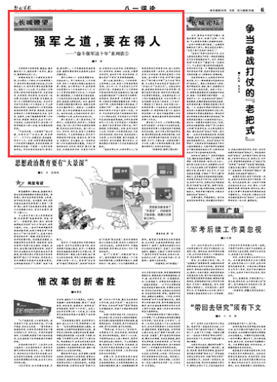 “千金何足惜,一士固難求”“選士用能,不拘長幼”“為政之要,惟在得人”……天下興亡、社稷安危、國運盛衰,皆系于人才。當前,世界軍事領域圍繞人才的競爭日趨激烈,雖然沒有硝煙,卻影響和決定著一個國家、一支軍隊的前途命運。歷史和現(xiàn)實告訴我們,強軍之道,要在得人。人才是推動我軍高質量發(fā)展、贏得軍事競爭和未來戰(zhàn)爭主動的關鍵因素。