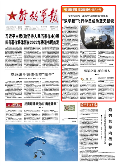 “現(xiàn)代戰(zhàn)爭,說到底是人才競爭。”習(xí)主席強調(diào),要堅持走好人才自主培養(yǎng)之路,堅持軍隊培養(yǎng)為主、多種方式相結(jié)合,形成具有我軍特色的人才培養(yǎng)和使用模式,提高備戰(zhàn)打仗人才供給能力和水平??哲娕c國內(nèi)一流大學(xué)“戰(zhàn)略聯(lián)姻”10年來,雙方站在強國興軍的新時代坐標(biāo)上,探索出軍事飛行人才培養(yǎng)新模式,譜寫了強軍報國的軍地合作新篇。