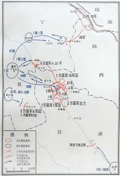 此時(shí),國民黨軍第37軍正準(zhǔn)備西渡黃河,“追剿”紅軍河西部隊(duì);東北軍第67軍等部經(jīng)紅軍勸阻,前進(jìn)緩慢;第3軍進(jìn)占同心城后,也停止前進(jìn);唯獨(dú)國民黨軍第1軍緊緊尾追紅軍,進(jìn)至豫旺地區(qū)。紅軍主力奉命向山城堡迅速靠近,打擊國民黨軍進(jìn)攻。16日,紅軍各部向山城堡南北地區(qū)集結(jié)。