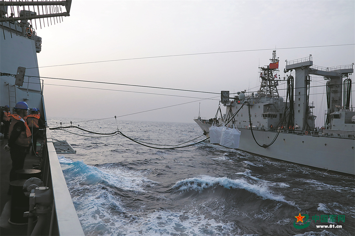 航行途中,開展橫向補(bǔ)給訓(xùn)練。