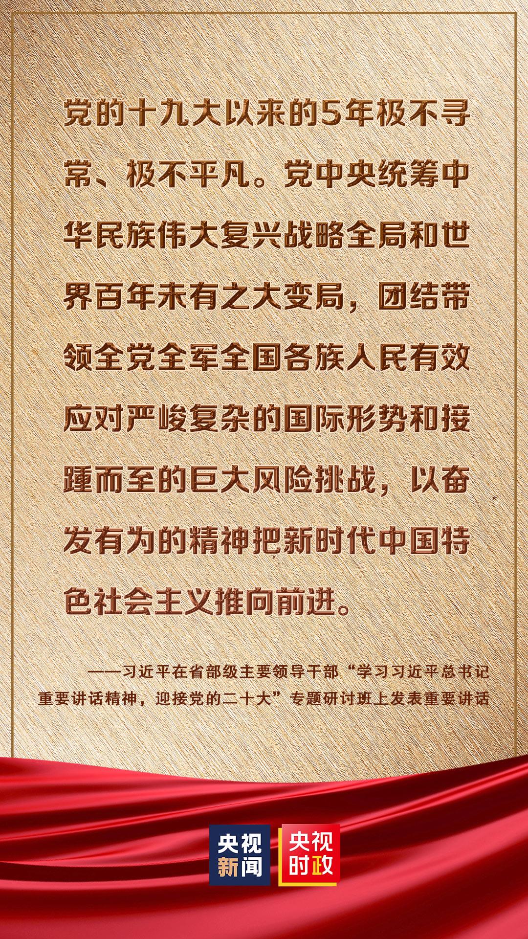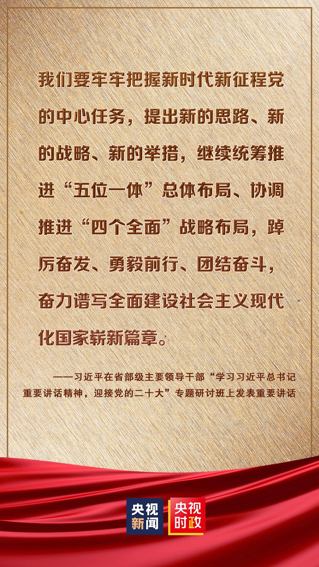 省部級(jí)主要領(lǐng)導(dǎo)干部“學(xué)習(xí)習(xí)近平總書(shū)記重要講話(huà)精神,迎接黨的二十大”專(zhuān)題研討班26日至27日在京舉行。中共中央總書(shū)記、國(guó)家主席、中央軍委主席習(xí)近平發(fā)表重要講話(huà)強(qiáng)調(diào),在全面建設(shè)社會(huì)主義現(xiàn)代化國(guó)家、向第二個(gè)百年奮斗目標(biāo)進(jìn)軍的新征程上,全黨必須高舉中國(guó)特色社會(huì)主義偉大旗幟,堅(jiān)持以馬克思主義中國(guó)化時(shí)代化最新成果為指導(dǎo),堅(jiān)定中國(guó)特色社會(huì)主義道路自信、理論自信、制度自信、文化自信,堅(jiān)定不移推進(jìn)中華民族偉大復(fù)興歷史進(jìn)程。我們要牢牢把握新時(shí)代新征程黨的中心任務(wù),提出新的思路、新的戰(zhàn)略、新的舉措,繼續(xù)統(tǒng)籌推進(jìn)“五位一體”總體布局、協(xié)調(diào)推進(jìn)“四個(gè)全面”戰(zhàn)略布局,踔厲奮發(fā)、勇毅前行、團(tuán)結(jié)奮斗,奮力譜寫(xiě)全面建設(shè)社會(huì)主義現(xiàn)代化國(guó)家嶄新篇章。