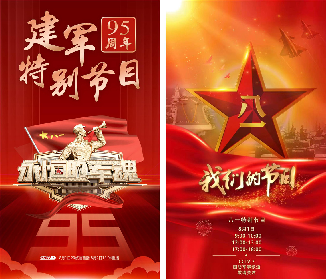 強(qiáng)軍興軍鍛造雄師,特別節(jié)目精心呈現(xiàn)。8月1日,央視國(guó)防軍事頻道(CCTV-7)黃金時(shí)段播出文藝節(jié)目《永恒的軍魂》,圍繞“傳承紅色基因、擔(dān)當(dāng)強(qiáng)軍重任”的主題,詮釋全軍官兵聽黨話、跟黨走,忠實(shí)履行新時(shí)代使命任務(wù)的堅(jiān)定決心。頻道還將推出多時(shí)段直播特別節(jié)目《我們的節(jié)日》,圍繞“光輝歲月、強(qiáng)軍為打贏、今天我過節(jié)”三大版塊,以分主題景觀、遞進(jìn)式新聞、演兵場(chǎng)連線、分會(huì)場(chǎng)聯(lián)動(dòng)、特寫式報(bào)道、征集互動(dòng)等多種形式,打造內(nèi)容豐富的節(jié)日軍旅節(jié)目。