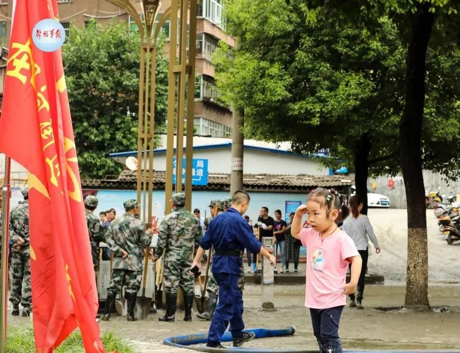 抗洪搶險現(xiàn)場,武警漢中支隊(duì)官兵和駐地救援力量在縣城廣場開展排水、清淤工作。當(dāng)?shù)匾晃荒赣H帶著女兒來到武警官兵休息點(diǎn),送上水和面包慰問子弟兵。慰問間歇,小女孩在武警漢中支隊(duì)的隊(duì)旗前敬了一個稚嫩又可愛的軍禮。