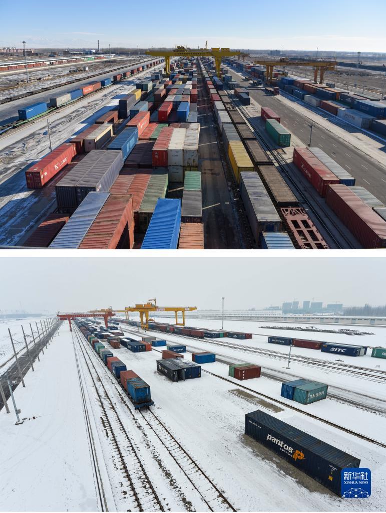 拼版照片:上圖為2021年2月6日拍攝的新疆霍爾果斯鐵路口岸換裝場內(nèi)的換裝作業(yè)場景(新華社記者 丁磊 攝);