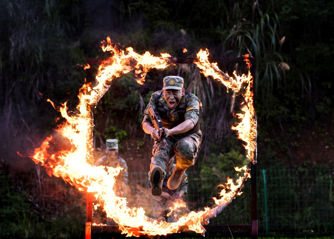 火箭軍某旅發(fā)射一營班長、一級軍士長何賢達(dá)在獵人意志訓(xùn)練中穿越火障(2022年6月26日攝)。新華社發(fā)(劉明松攝)