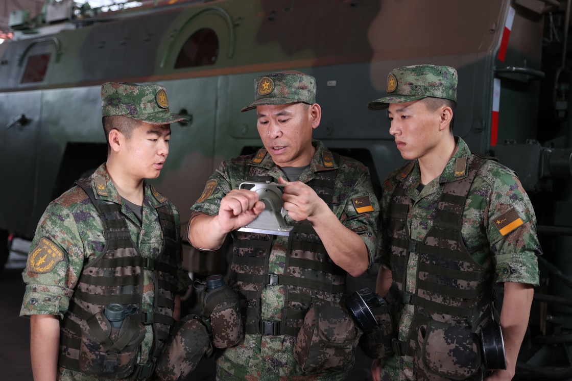 火箭軍某旅發(fā)射一營班長、一級軍士長何賢達(dá)(右二)幫助新排長掌握專業(yè)技能(2022年6月26日攝)。新華社發(fā)(劉明松攝)
