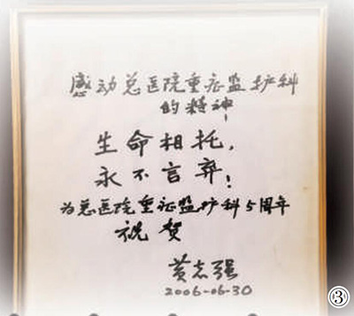 科室走廊兩側(cè)的文化墻上,標(biāo)注科室成員生日的一顆顆“果實(shí)”高掛在“生命之樹”上,老一輩人民軍醫(yī)黃志強(qiáng)院士書寫的“生命相托,永不言棄”,作為“科訓(xùn)”激勵(lì)著每一個(gè)人。
