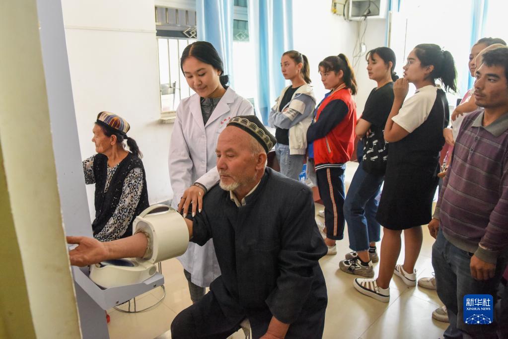 在新疆和田市伊里其鄉(xiāng)中心衛(wèi)生院,居民接受免費(fèi)健康體檢(2019年8月23日攝)。新華社記者 丁磊 攝