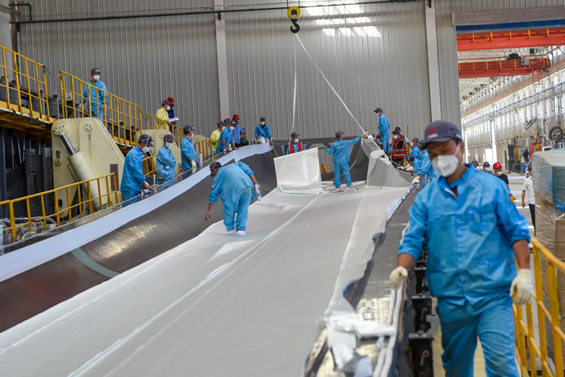 新疆生產(chǎn)建設兵團新星經(jīng)濟技術開發(fā)區(qū)一家風電葉片企業(yè)的員工在車間忙碌(2022年7月27日攝)。新華社記者 丁磊 攝