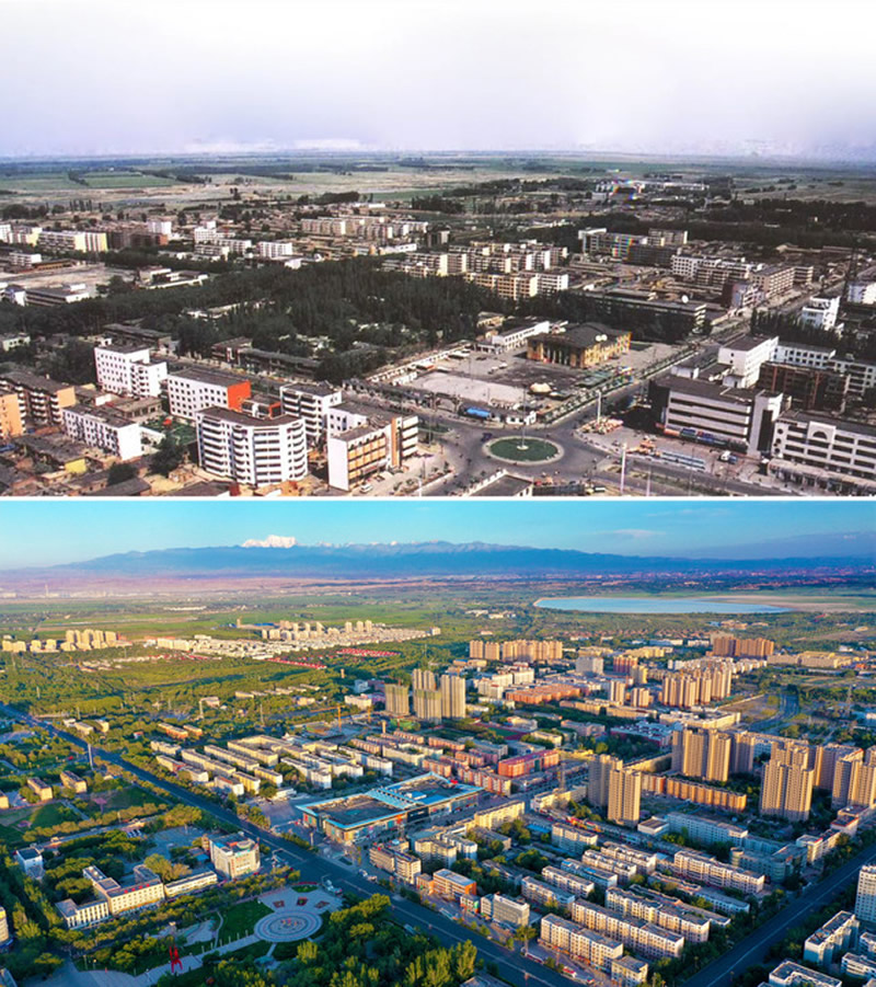 拼版照片:上圖為2000年拍攝的新疆生產(chǎn)建設兵團農(nóng)六師五家渠市(資料照片);下圖為2020年7月26日無人機拍攝的新疆生產(chǎn)建設兵團第六師五家渠市(李華北攝)。新華社發(fā)