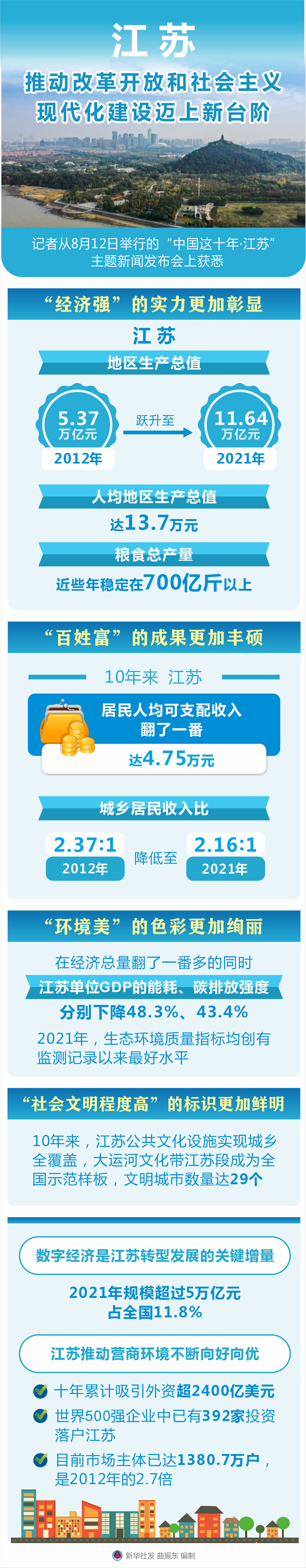 新華社南京8月12日電(記者陳剛)記者從12日舉行的“中國這十年·江蘇”主題新聞發(fā)布會上獲悉,黨的十八大以來,江蘇沿著習(xí)近平總書記指引的方向踔厲奮發(fā)、勇毅前行,努力推動改革開放和社會主義現(xiàn)代化建設(shè)邁上新臺階。
