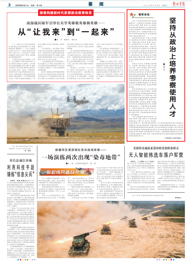 近日,習主席在主持中共中央政治局第四十一次集體學習時強調(diào),要堅持從政治上培養(yǎng)、考察、使用人才,把黨對軍隊絕對領(lǐng)導(dǎo)貫徹到人才工作各方面和全過程,確保槍桿子始終掌握在對黨忠誠可靠的人手中。這要求我們在人才工作中必須牢牢把住政治關(guān),扎實做好鑄魂育人和政治考察工作。