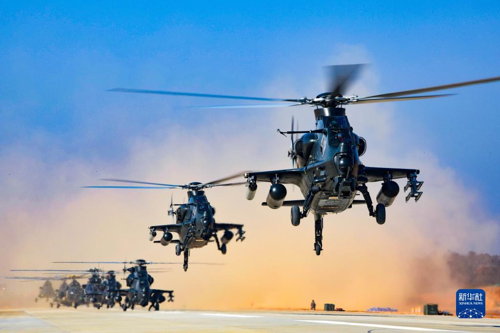 陸軍第73集團軍某陸航旅組織飛行訓(xùn)練,戰(zhàn)機編隊依次起飛(2021年4月22日攝)。新華社發(fā)(李士龍 攝)