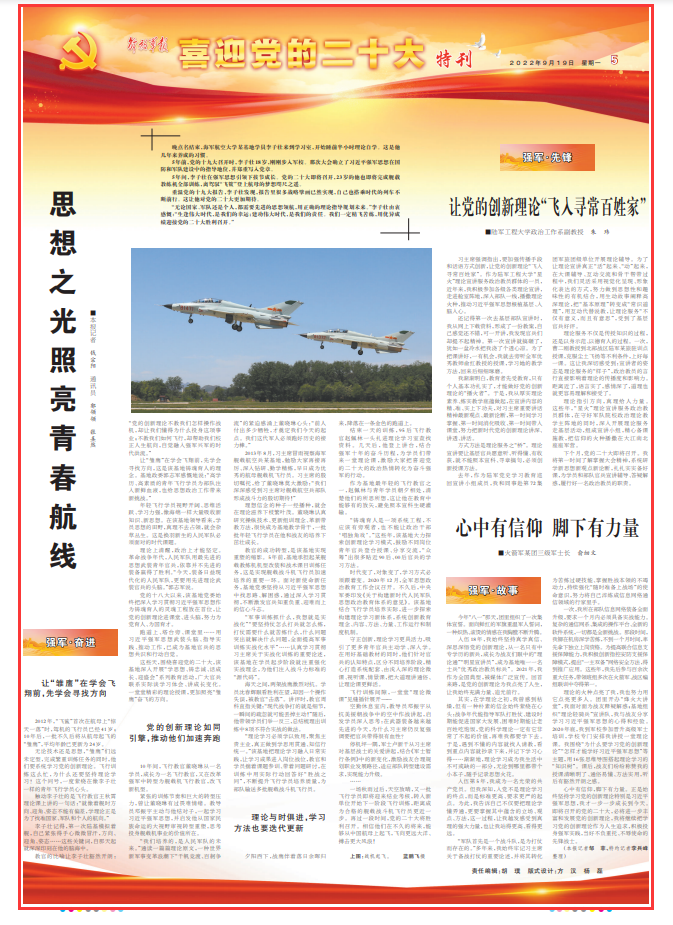 “無論國家、軍隊還是個人,都需要先進的思想領航,用正確的理論指導規(guī)劃未來。”李子壯由衷感慨:“生逢偉大時代,是我們的幸運;建功偉大時代,是我們的責任。我們一定精飛苦練,用優(yōu)異成績迎接黨的二十大勝利召開?!?/p>